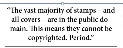 First and foremost: The vast majority of stamps – and all covers – are in the public domain. This means they cannot be copyrighted. Period. It doesn’t matter what rights are “claimed”; it is all public domain. A specific presentation of stamps or covers can be copyrighted, however. More about that later.