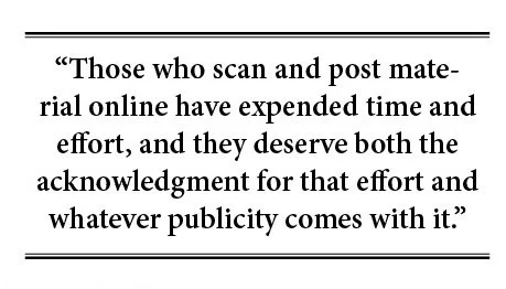 That having been said, however, this does not give us free license to ride roughshod over the hard work others have expended in scanning and posting material. Anyone knowingly using material from either private or commercial websites without acknowledging their origin is doing themselves and the hobby a disservice. Those who scan and post material online have expended time and effort, and they deserve both the acknowledgment for that effort and whatever publicity comes with it.